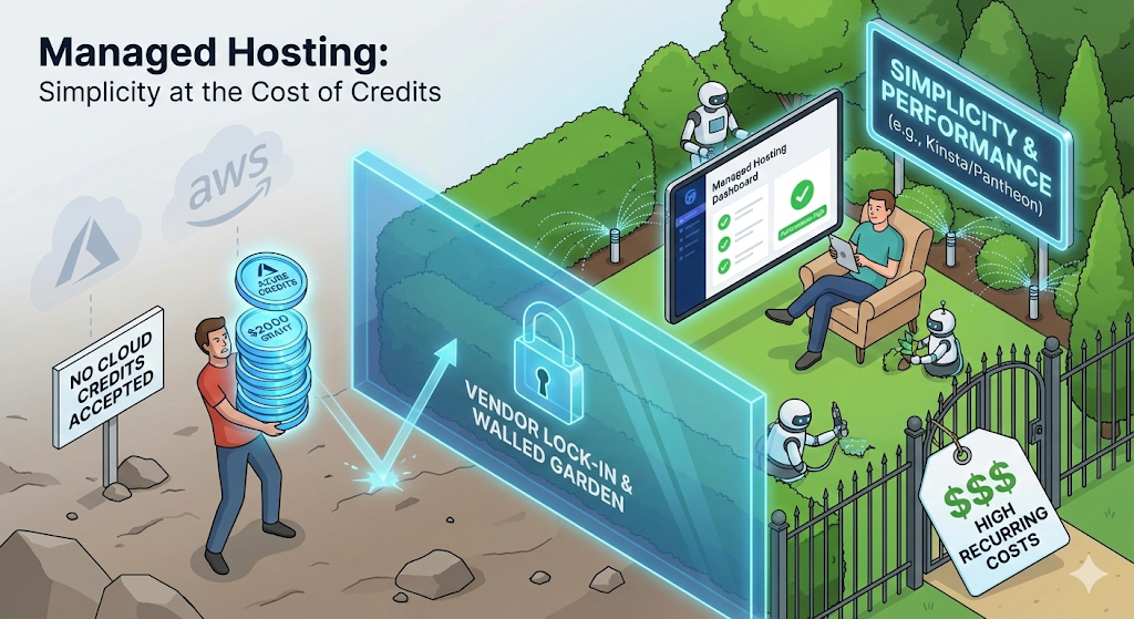This creates a false choice: drown in unmanageable DIY complexity or pay premium prices for managed hosting that locks you out of your own cloud credits.